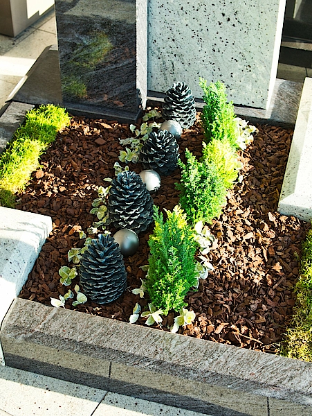 Die Pflanzen sollten also nicht vom Stein ablenken. „Weniger ist oft mehr“ ist hier unsere Empfehlung. Bei kleinen Grabflächen ist es sinnvoll, nicht zu viele Pflanzenarten miteinander zu mischen und die Farbwahl auf ein oder zwei Farben zu beschränken. Einen Anhaltspunkt bei der richtigen Aufteilung der Pflanzfläche bietet der goldene Schnitt. Zum Beispiel kann 60 Prozent der Fläche mit Bodendeckern und 40 Prozent mit zur Jahreszeit passenden Blumen und Pflanzen versehen werden. So wirkt die Grabstätte harmonisch und es entsteht ein meditativer Ort der Ruhe und des Rückzugs.